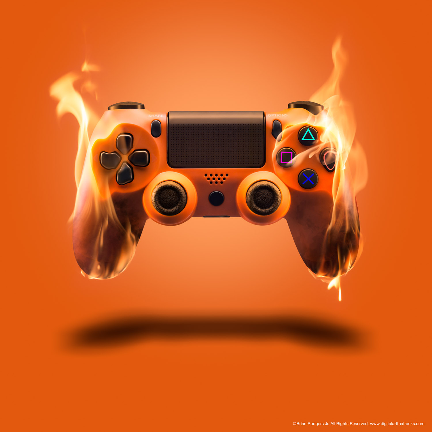 “Death of the Gaming Console” - Playstation Controller On Fire. In this before and after, you’ll see a red playstation controller floating over a small studio setup. To play off of the concept of home gaming consoles becoming obsolete due to cloud based platforms, set it on fire; digitally of course. In addition to photographing and retouching the video game console controller to sheer perfection, I also photographed my own original asset library of flames and then meticulously composited them into the final image. Because I shoot with super high resolution cameras, work with a lot of bit depth and a wide gamut color profile, I’m able to push, pull, bend and twist pixels to my hearts content.